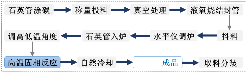 高溫固相合成是在高溫下,固體界面間經(jīng)過(guò)接觸、反應(yīng)、成核、晶體生長(zhǎng)反應(yīng)而生成一大批化合物。高溫固相法制備工藝簡(jiǎn)單,合成的粉體無(wú)團(tuán)聚、填充性好,具有成本低、產(chǎn)量大等優(yōu)點(diǎn),是工業(yè)生產(chǎn)上常用的方法。將反應(yīng)原料按不同摩爾比精確稱量,混勻后裝入涂碳石英管,經(jīng)液氧燒結(jié)真空封管后裝爐。根據(jù)反應(yīng)原料的不同性質(zhì),控制不同的反應(yīng)溫度。