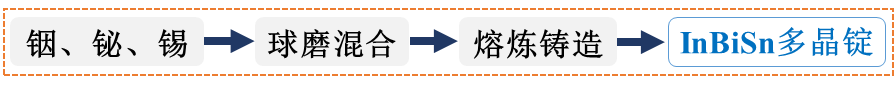 熔煉鑄造法適用于制備高純高致密的靶材,且工藝簡(jiǎn)單,可簡(jiǎn)述成三步:原料熔煉、澆注成錠、鑄錠加工。熔煉鑄造法的主要產(chǎn)品是高純合金錠,以銦鉍錫(In-Bi-Sn)多晶錠為例,具體工藝參數(shù)如下: